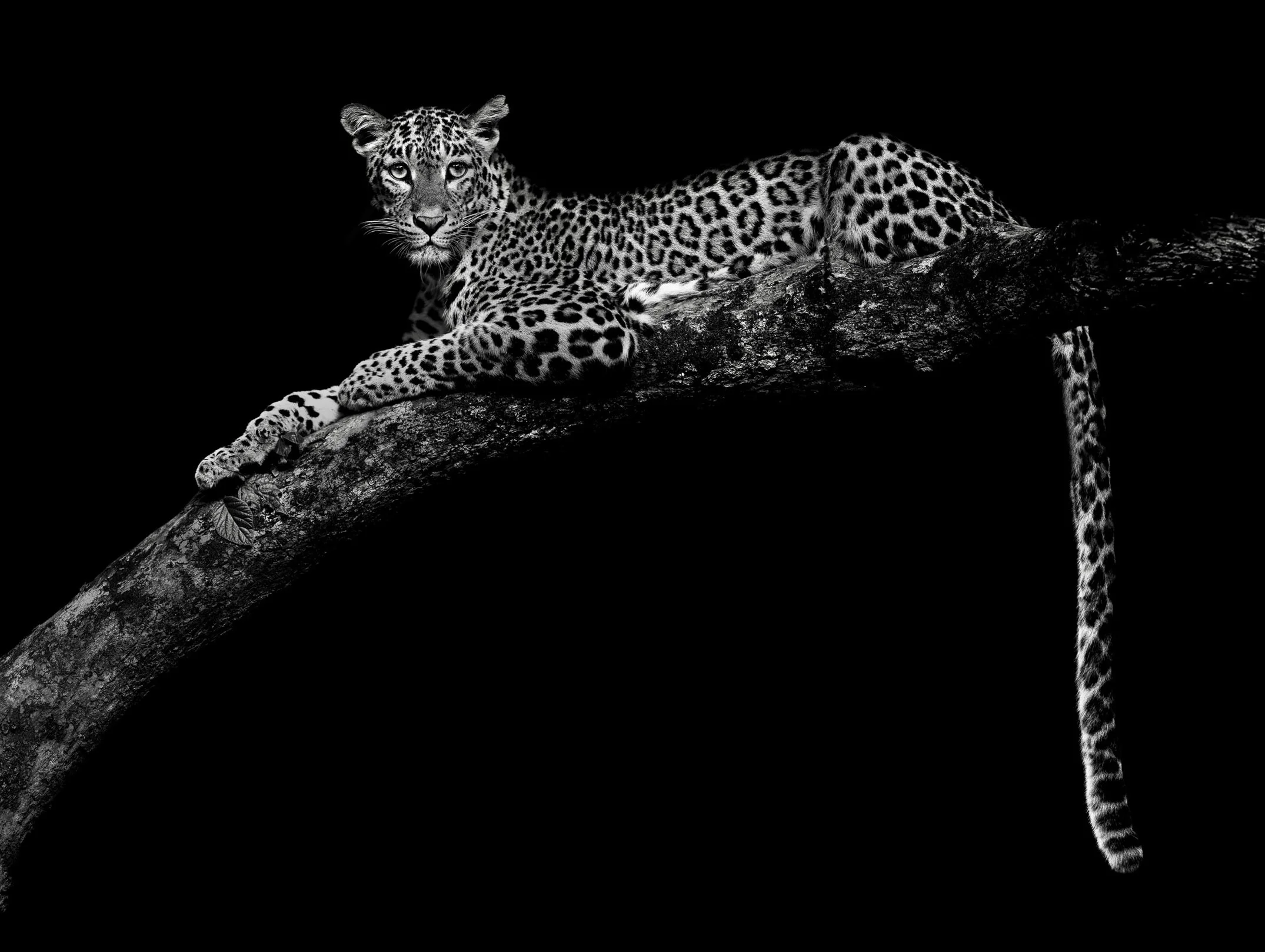 We had stopped the Jeep, waiting for a rustle in the thicket to reveal an elephant. For a full minute, our eyes were fixed on the road ahead—until I looked to the left. Just forty feet away, draped over a low branch, sat this leopardess. She had been watching us the entire time, her expression almost a challenge to our lack of observation. Unfazed by our presence, she remained perfectly still, allowing me the time to capture a 12-shot panorama. This technique preserves the staggering detail of her coat and the weight of her limbs against the wood, creating a portrait that feels as intimate as the encounter itself.